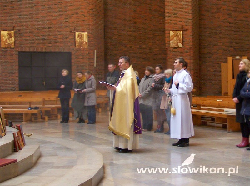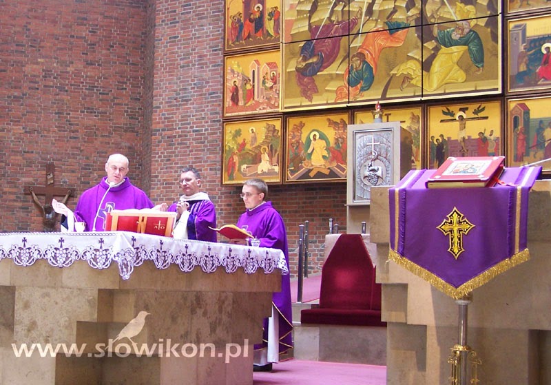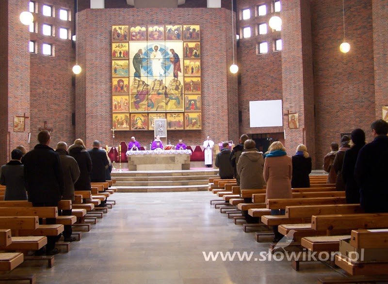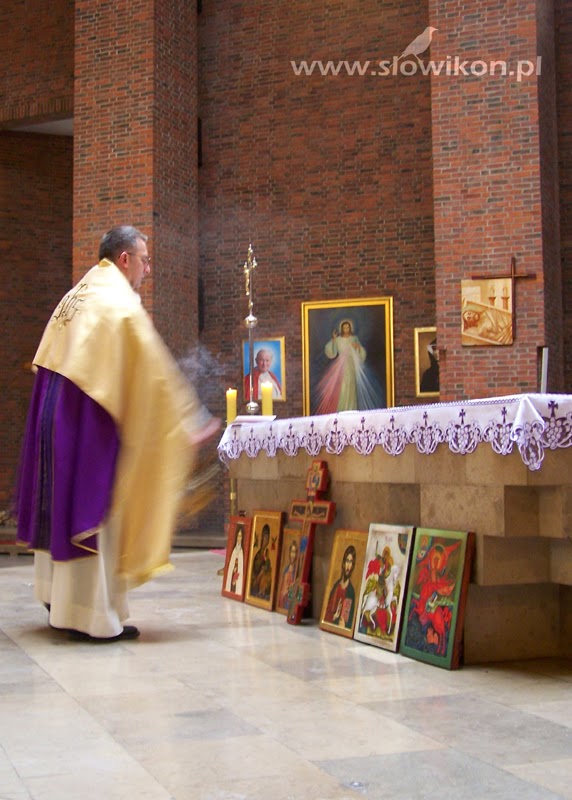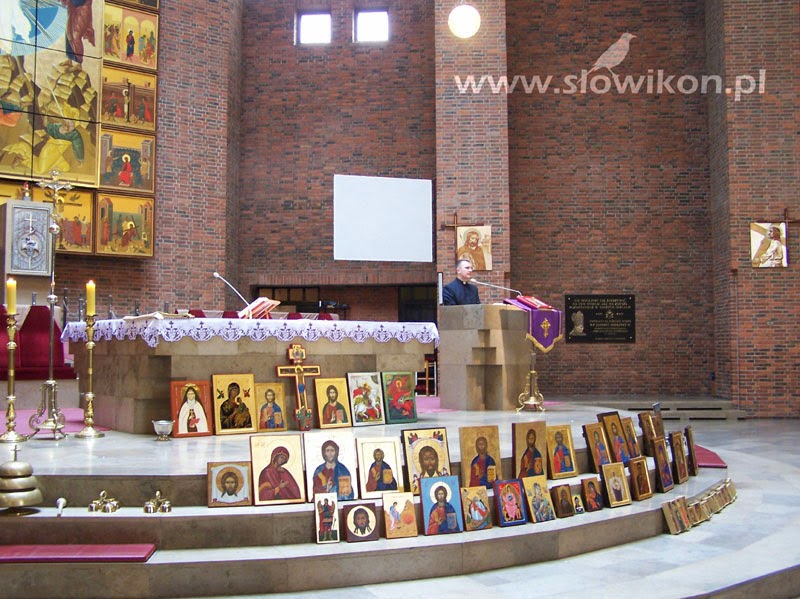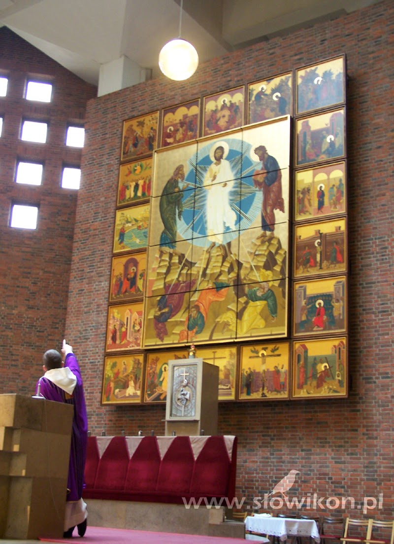 O godzinie 12.00 zebraliśmy się w kościele pod wezwaniem Przemienienia Pańskiego w Opolu, by przed ołtarzem złożyć nasze ikony, przeznaczone do poświęcenia. Nieprzypadkowo wybraliśmy ten właśnie kościół. W prezbiterium znajduje się tam ogromnych rozmiarów (7,42 x 6,18 m.) dzieło sztuki ikonopisarskiej. Jego centrum stanowi duża ikona Przemienienia Pańskiego, otaczają ją mniejsze pola z przedstawieniami scen z życia Pana Jezusa.