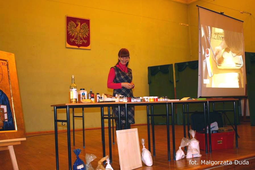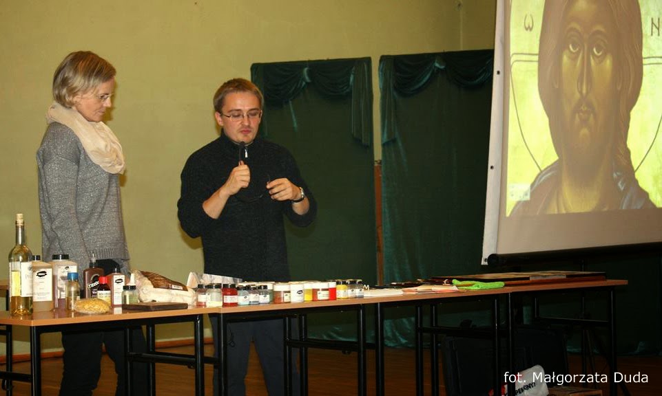 Następnie Małgorzata Duda (prowadząca obecne szkółkę ikonopisarską „Theotokos School” przy parafii Najświętszego Serca Pana Jezusa w Kluczborku), omówiła jak powstaje tempera jajowa, jak przygotować medium z którym mieszane są pigmenty.