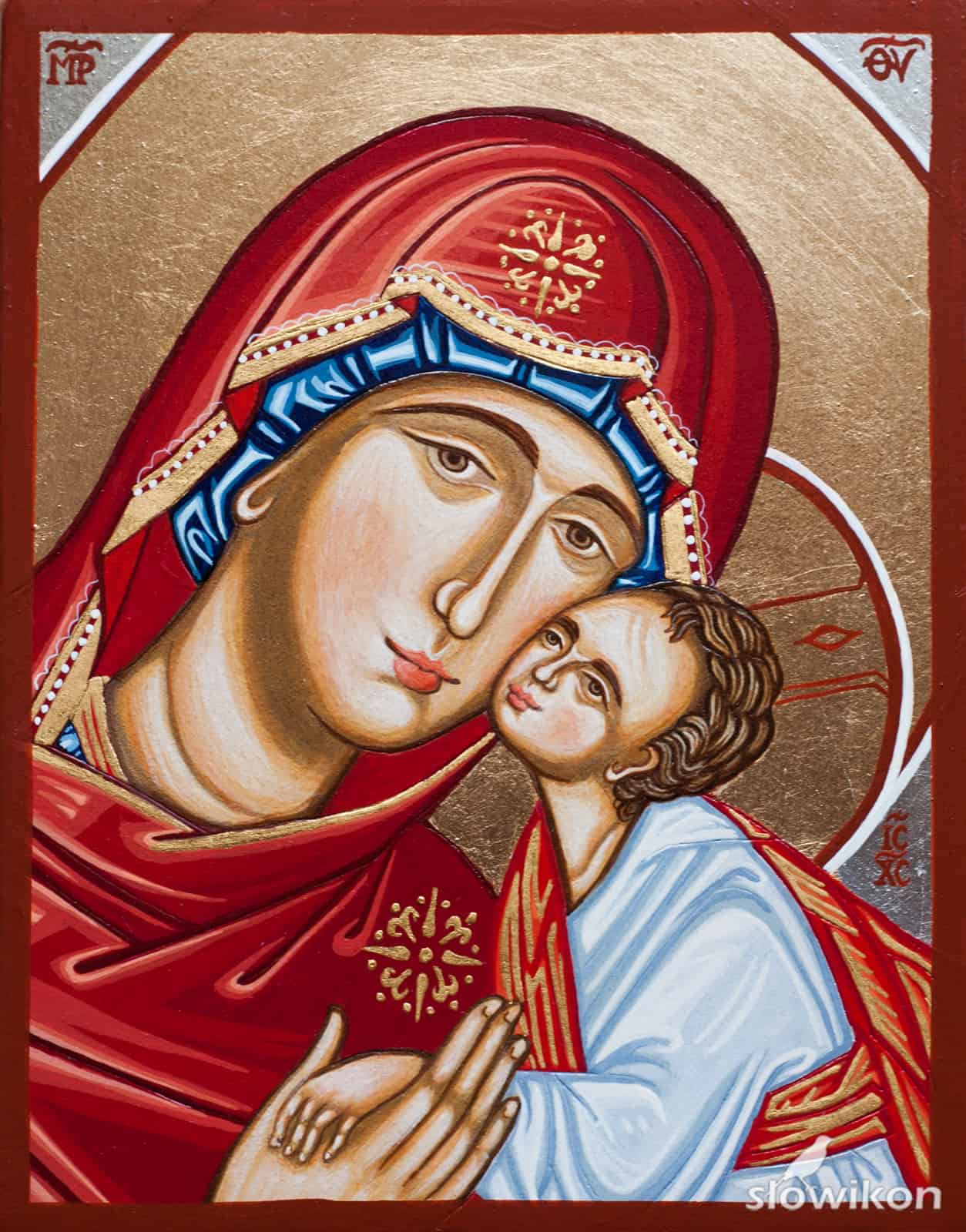 Ikona Matka Boża Eleusa napisana według tradycyjnej technologii ikonopisarskiej. Podobrazie: deska lipowa ze szpongami, pokryta gruntem kredowo- klejowym. Wymiary: 20 x 28 cm. Namalowana temperą…