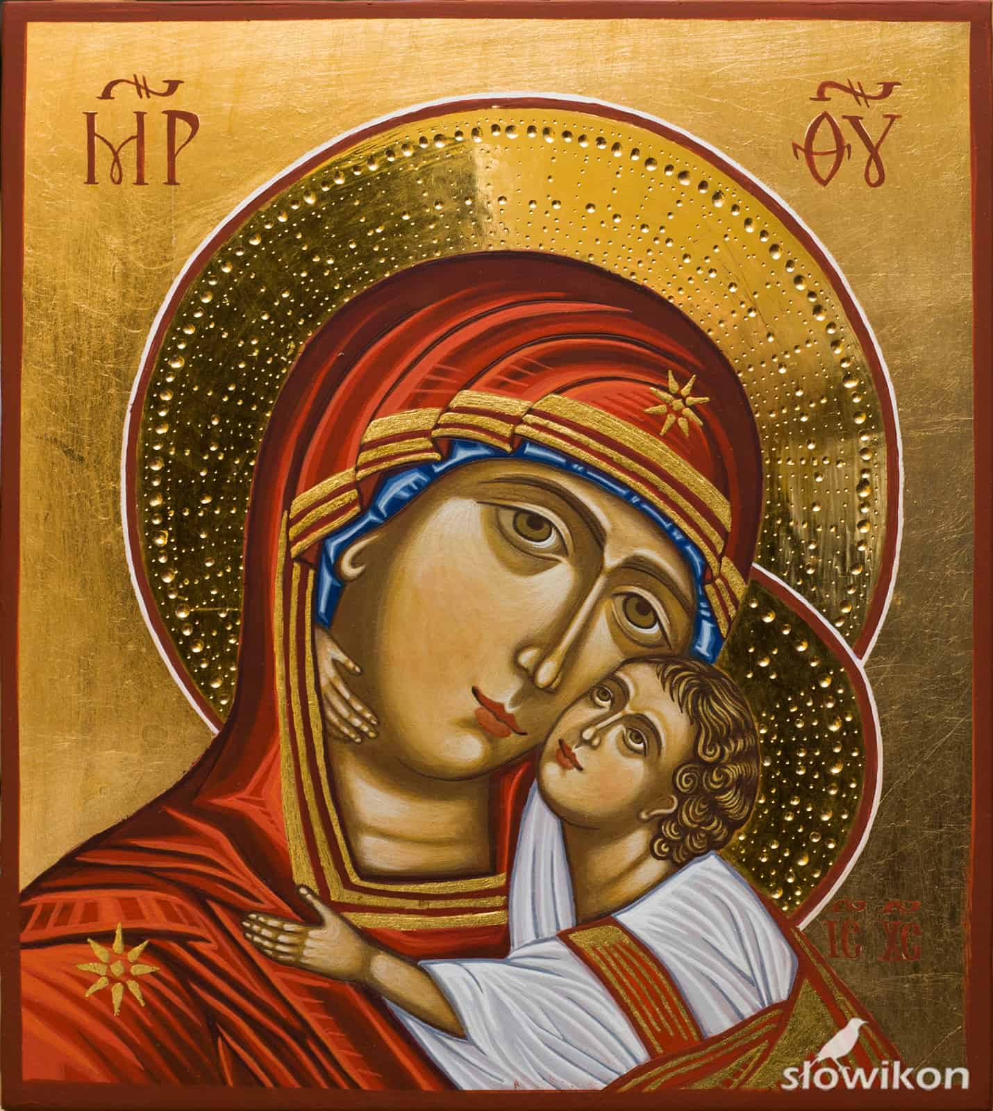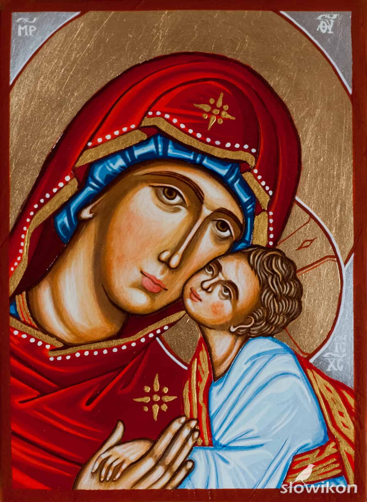 Ikona Matka Boża Eleusa, napisana temperą jajową na gruncie kredowo – klejowym. Nimby złocone szlagmetalem, tło – szlagaluminium, asystki złocone złotem transferowym 23,75 ct. Podobrazie:…